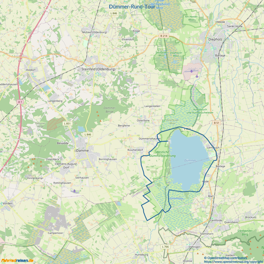 Wir beginnen im Nordosten am Dümmer-Museum in Lembruch, dem alten "Lewenbrocke". Im 12. Jahrhundert von den "Wischfriesen" gegründet, die den Sumpf um den Dümmer trocken legten. Der heutige Dümmer-Deich wurde 1953 fertiggestellt. Das Dümmer-Museum zeigt und erklärt alles rund um den Landschafts- und Naturraum Dümmer mit seine Mooren – einfach sehenswert. Durch das Naturschutzgebiet Hohe Sieben geht es in den im Südosten des Dümmers liegenden malerischen Ort Hüde mit seinem alten reetgedeckten Niedersachsenhäusern. Man trifft auf ein Storchenpaar und kann dieses bei der Aufzucht ihrer Jungen beobachten. Weiter in das Naturschutzgebiet "Ochsenmoor". Beobachtet werden können Kranich, Bekassine oder Kiebitz – ein Vogelschutzgebiet von internationaler Bedeutung. Rechts und links wiedervernässte Flächen. Die Naturschutzstation und der "Natur-Erlebnis-Pfad" geben Informationen über die Tier- und Pflanzenwelt am Dümmer-See. Im Südwesten des Sees liegt der "Schäferhof". Dort trifft man in der warmen Jahreszeit mit viel Glück ebenfalls auf weitere Störche. Weiter geht es auf der Westseite des Dümmers durchs Hüder Moor, entlang der Wiesen bis Rüschendorf. Von dort aus weiter in Richtung Dümmerlohausen. Es lohnt ein Abstecher zum Vogelmuseum oder zum Olgahafen. Vorbei am "Osterfeiner Moor" und den Wochenendhäusern in Eickhöpen endet diese Tour wieder in Lembruch.