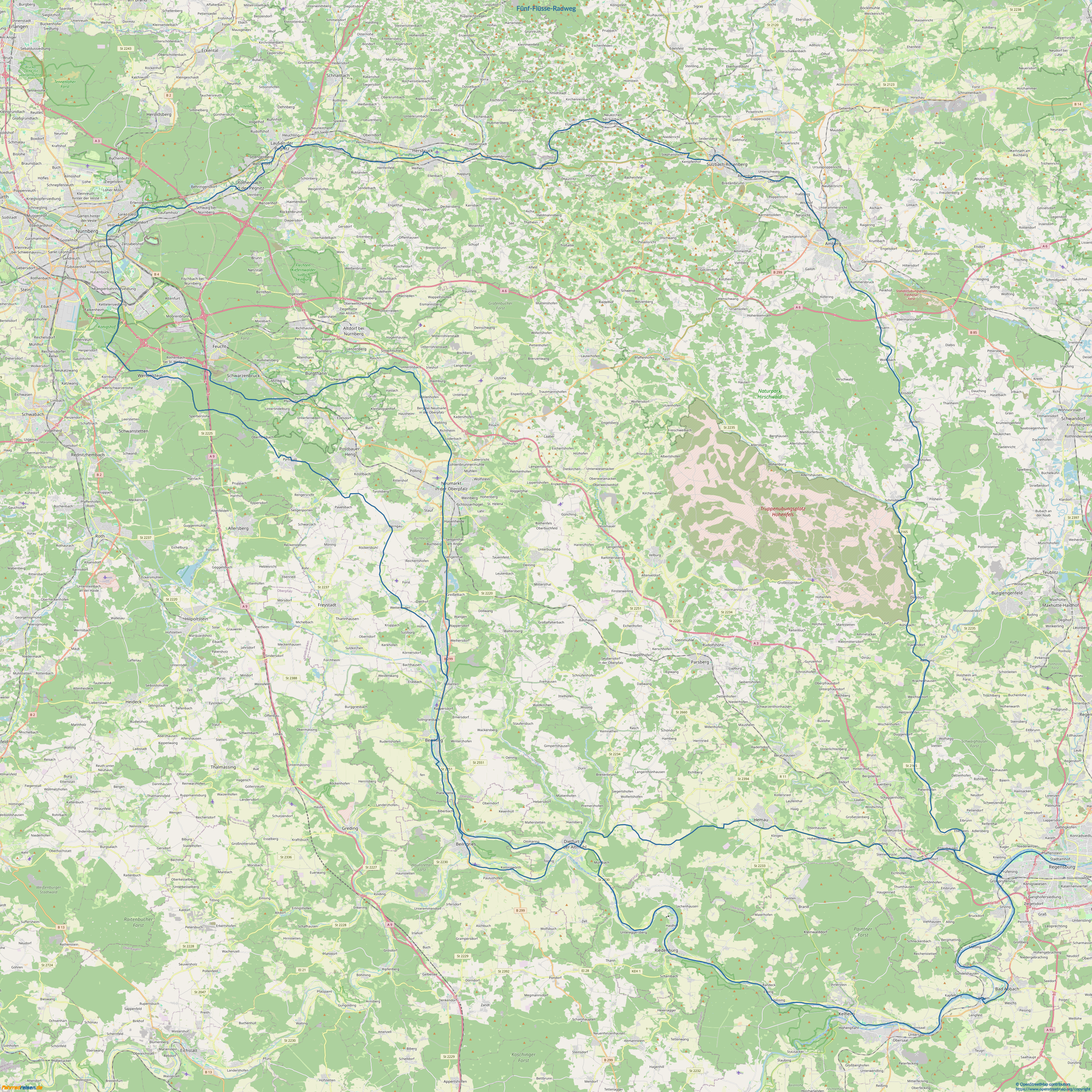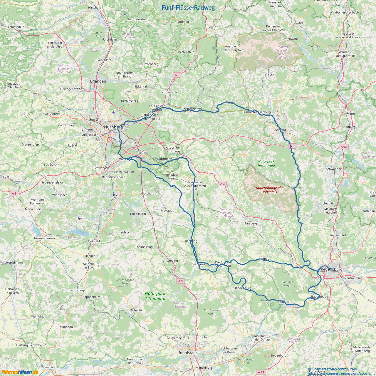Die Gesamtlänge von Regensburg über Amberg, Nürnberg, Freystadt, Riedenburg, Kelheim bis Regensburg beträgt 311 km