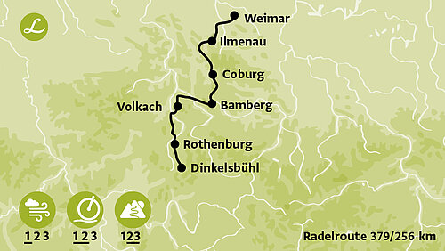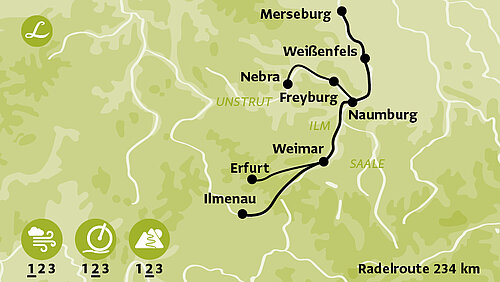 Wir fahren durch eine reizvolle und geologisch abwechslungsreiche Landschaft – vorbei an Burgen, Schlössern und Kirchen, historischen Mühlen und idyllisch gestalteten Parkanlagen in den Ilm-Auen. Orte, die ihren ursprünglichen Charakter erhalten haben, laden mit zahlreichen Sehenswürdigkeiten zum Verweilen ein. Jeder Ort, von Allzunah bis Großheringen, hat seine eigene Geschichte zu bieten. Johann Wolfgang von Goethe hat in Stützerbach, der Goethe- und Universitätsstadt Ilmenau, in Bad Berka und sowie der Klassikerstadt Weimar und deren Umland gewirkt. Überall sind seine Spuren und die vieler anderer deutsche Kulturheroen zu besichtigen.