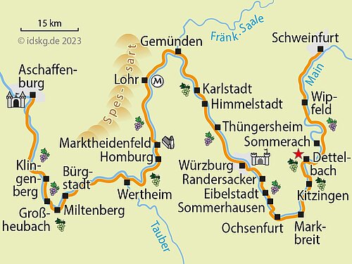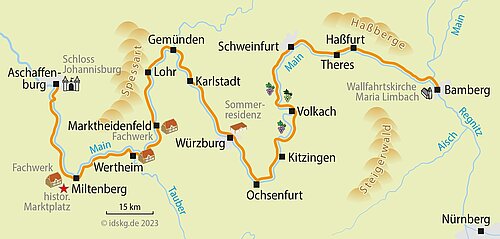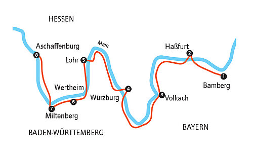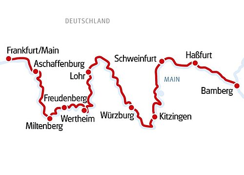 Die Tour beginnt alternativ an den Quellen des Roten Mains bei Creußen in der Fränkischen Schweiz oder am Ursprung des Weißen Mains im Fichtelgebirge. Die beiden Streckenvarianten sind nahezu gleich lang: 60 Kilometer Länge weist der Abschnitt am Weißen Main durch Fichtelgebirge und Frankenwald auf, 65 Kilometer der Weg am Roten Main durch die Fränkische Schweiz bis zum Zusammenfluss kurz hinter Kulmbach. Durch die Naturlandschaften des Obermain Juras, der Haßberge und des Steigerwaldes, des Fränkischen Weinlandes mit der barocken Metropole Würzburg, des Lieblichen Taubertals mit Wertheim und schließlich der Ferienregion Spessart-Mainland führt die reizvolle Route nach Aschaffenburg, in das "bayerische Nizza". Auf der letzten Etappe geht es über Frankfurt am Main, dessen "Museumsufer" einen Besuch lohnt, bis zur Main-Mündung bei Mainz und Wiesbaden.