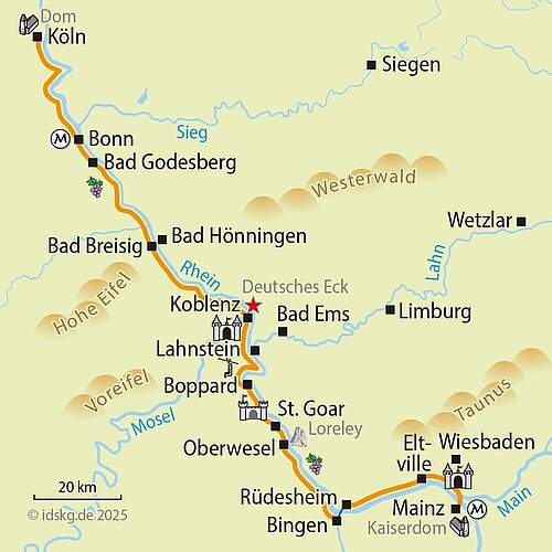 Es ist immer schwer, die schönste Etappe von langen Radtouren zu benennen – viele bieten Höhepunkte. Und besonders am Rhein, diesem geschichtsträchtigen Fluss fällt die Wahl nicht leicht. Mit Sicherheit nimmt die Etappe im Mittelrheintal auf linksrheinischer Seite einen der ersten Plätze ein. Entlang der 130 Kilometer dieses Abschnittes in der schönsten romantischen Lage trifft man auf der Radtour auf über 70 Burgen. Diese sind links und rechts des Flusses verteilt. Auf kleinen Radtouren von den Standorten aus lassen sich eine Auswahl von Ihnen auch aus der Nähe besuchen.
