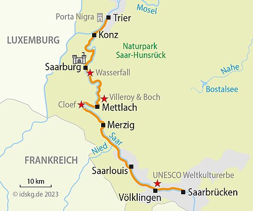 Auf dem Rad an der Saar entlang führt der Weg nach Mettlach. Die weltberühmte Porzellanmanufaktur Villeroy & Boch hat hier ihren Firmensitz. Sehenswert sind die dazugehörige Keravision, eine ungewöhnliche Ausstellung, die durch die spannende jahrhundertalte Firmengeschichte der von Bochs führt und der "Living Planet Square", der von André Heller konzipiert wurde und aus dem Pavillion, der Figur des Erdgeistes (14 m) und der "Weltkarte des Lebens" (137.008 Einzelfliesen) besteht. Von Mettlach lohnt auch ein Abstecher zur Saarschleife, der bekanntesten Flussbiegung und dem Wahrzeichen des Saarlandes. Der Aussichtspunkt Cloef bietet den wohl schönsten Blick auf dieses Wunderwerk der Natur. Das nächste Ziel auf dem Saar-Radweg ist Saarburg. Ein bezauberndes Städtchen mit einem kleinen Wasserfall und einer Burg. Von hier ist das Ziel der Tour nicht mehr weit – die Saarmündung in Konz.