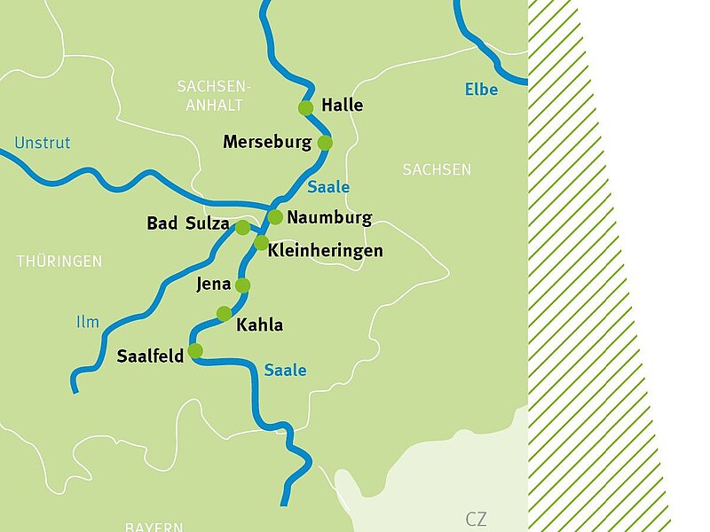 Beginnend in Saalfeld mit seinen mystischen Feengrotten, radeln Sie über Rudolstadt in die Porzellanstadt Kahla. Sie besuchen außerdem die Universitätsstadt Jena und können den Saale-Canyon mit seinen Wellenkalkbergen bestaunen. Ziel der Bummeltour ist die Händelstadt Halle mit ihren vielseitigen kulturellen Angeboten.
