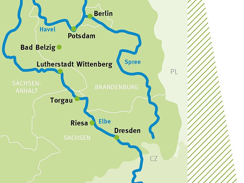 Dann aber setzen Sie Ihre Fahrradtour im Inland fort und folgen dem internationalen Europaradweg R1, der Sie direkt bis in die deutsche Hauptstadt bringt. Verbinden Sie bei dieser Fahrradtour das bezaubernde Elbflorenz mit der turbulenten Spreemetropole Berlin und radeln Sie so entlang von mehreren wichtigen, deutschen Flüssen: Denn nicht nur die Elbe begleitet Sie auf dieser Fahrradtour nach Berlin, auch die Havel und die Spree werden Ihnen begegnen!