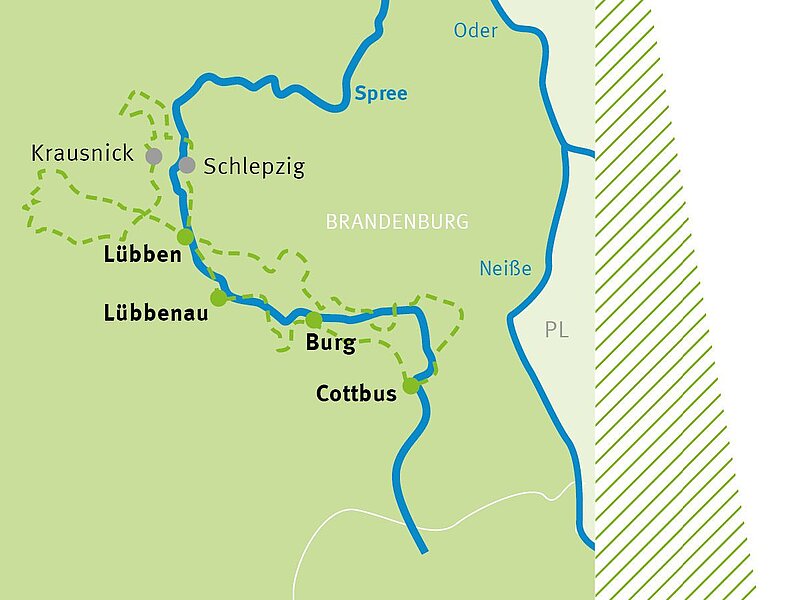 Sie radeln den Gurkenradweg von Lübbenau zunächst nach Lübben und dann in den westlichen Unterspreewald. Eine Schleife über Golßen (Wendepunkt) führt Sie schließlich wieder nach Lübben - dem heutigen Tagesziel.