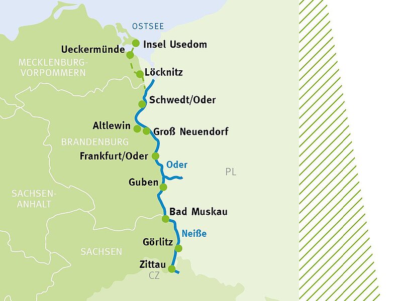 Der Oder-Neiße-Radweg beginnt im tschechischen Nova Ves und führt über Liberec gut 32 Kilometer durch die Tschechischen Republik, bevor er die Grenze zu Deutschland passiert. Auf dieser Fahrradtour am Oder-Neiße-Radweg von Zittau nach Usedom radeln Sie also fast den kompletten Radweg entlang bis nach Ueckermünde und setzen Ihre Fahrradtour dann noch bis zur Sonneninsel Usedom fort.