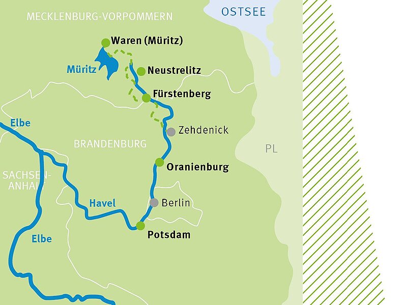 Sie beginnen Ihre Radreise am Havel-Radweg in Waren (Müritz), im Herzen der mecklenburgischen Seenplatte. Von hier aus radeln Sie über die seen- und waldreiche Umgebung bis nach Fürstenberg. Weiter führen Ihre Radtouren am Havel-Radweg nach Zehdenick und anschließend vorbei am historischen Oranienburg und über Berlin-Spandau bis nach Potsdam. Hier lockt ein Bummel durch die Altstadt mit ihren historischen Gebäuden und alten Fachwerkhäusern.
