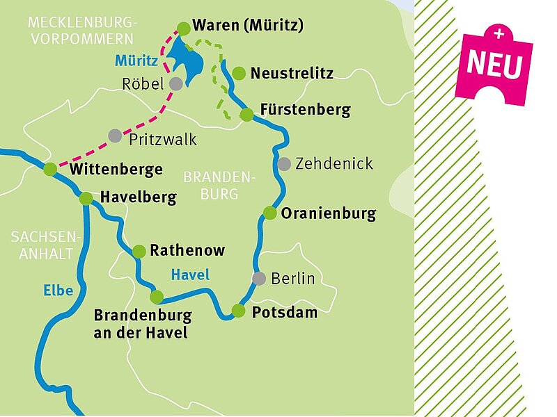 Ausgehend vom Luftkurort und Heilbad Waren (Müritz) folgen Sie dem Havel-Radweg über Berlin-Spandau bis zur Mündung der Havel in die Elbe vor Wittenberge. Der Radweg verläuft größtenteils auf ebener Strecke und ist genau das Richtige für jeden Naturliebhaber.