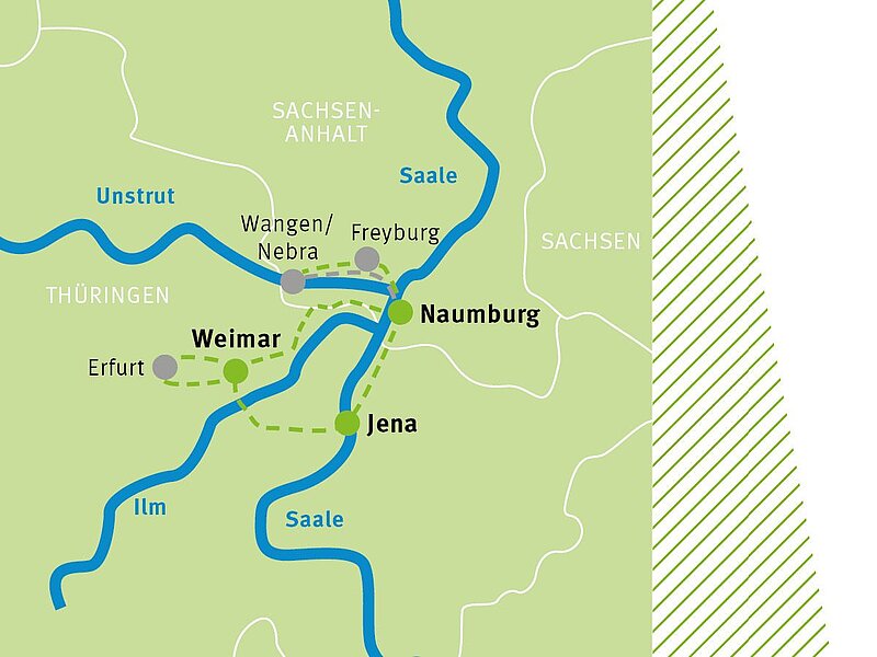 Genießen Sie zudem die Weine der Saale-Unstrut-Region und sammeln Sie während Ihrer Fahrradtouren an Saale, Ilm und Unstrut ab Weimar über Naumburg bei typischen Gerichten der Thüringer Küche neue Kraft. Ausgangs- und Endpunkt dieser Radreise ist die historische Stadt Weimar, die ebenfalls zum Staunen, Entdecken und Verweilen einlädt.
