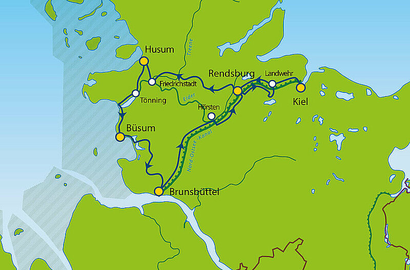Schiffe gucken satt - und mit den Schiffen radeln. Sie radeln von Kiel über Rendsburg zu den Grachten von Friedrichstadt. Über die Eider zur Nordseeküste nach Büsum und Brunsbüttel. Hier geht es immer entlang des Nord-Ostsee-Kanals zurück nach Kiel.