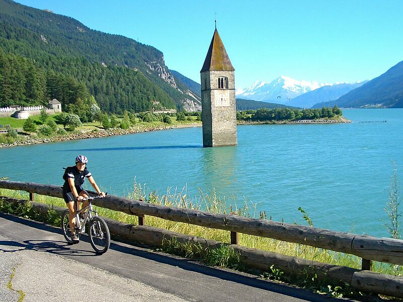 Sie starten die erste Etappe am Reschensee entlang, mit Blick auf die versunkene Kirche von Graun. Über das mittelalterliche Städtchen Glurns mit seiner vollständig erhaltenen Stadtmauer erreichen Sie Ihr Ziel Schlanders, der Hauptort des Vinschgaues.