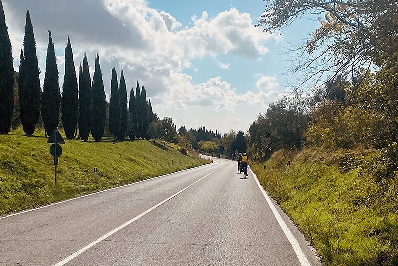 Wir radeln auch ein Stück auf der „Eroica“, der in Italien berühmten und landschaftlich beeindruckenden Heldenstraße, auf der jedes Jahr Anfang Oktober das große Radspektakel mit über 3000 Teilnehmern stattfindet.