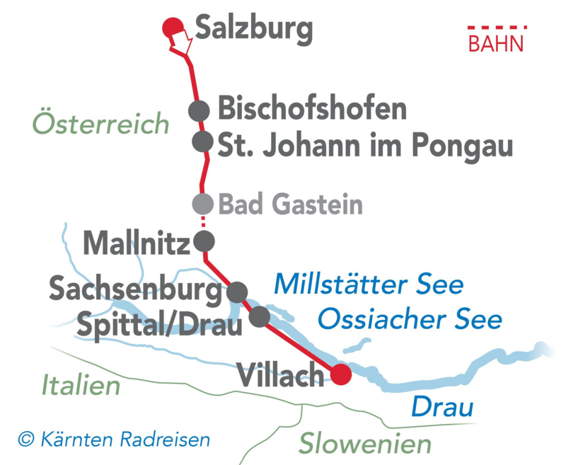 Der grenzüberschreitende Ciclovia Alpe-Adria Radweg ist ein unvergessliches Erlebnis. Die Radtour führt im 1. Teil von der Mozartstadt Salzburg an die Südseite der Alpen nach Villach. Ab Salzburg geht es entlang der Salzach am Tauernradweg via Bischofshofen durch die herrliche Salzburger Gebirgswelt ins Gasteinertal mit dem bekannten Kurort Bad Gastein. Dort besteigen Sie den Zug und die Alpendurchquerung erfolgt ganz bequem per Bahnfahrt in nur wenigen Minuten.