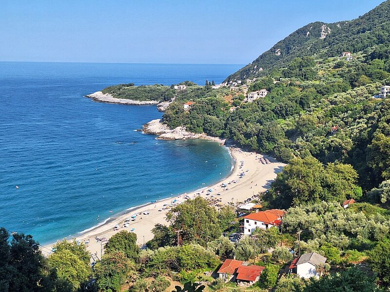 Zu den Traumstränden Damouchari und Milopotamos zieht es uns heute. Dabei gilt es, knackige Höhenmeter zu bewältigen, um die Strände zu entdecken. Damouchari wurde ab 2008 bevölkert, nachdem hier einige Szenen des legendären Films Mamma Mia über die Formation Abba gedreht wurden. Nach einem Café und Erfrischungsbad schrauben wir die Serpentinen herauf, um die spektakuläre, kurvenreiche Abfahrt ab Tsagkarada nach Milopotamos zu nehmen. Für die Auffahrt später empfehlen wir, sich vorher nochmals in der Traumbucht abzukühlen. (Mittags- Badepause, 31 km, 1130 HM)
