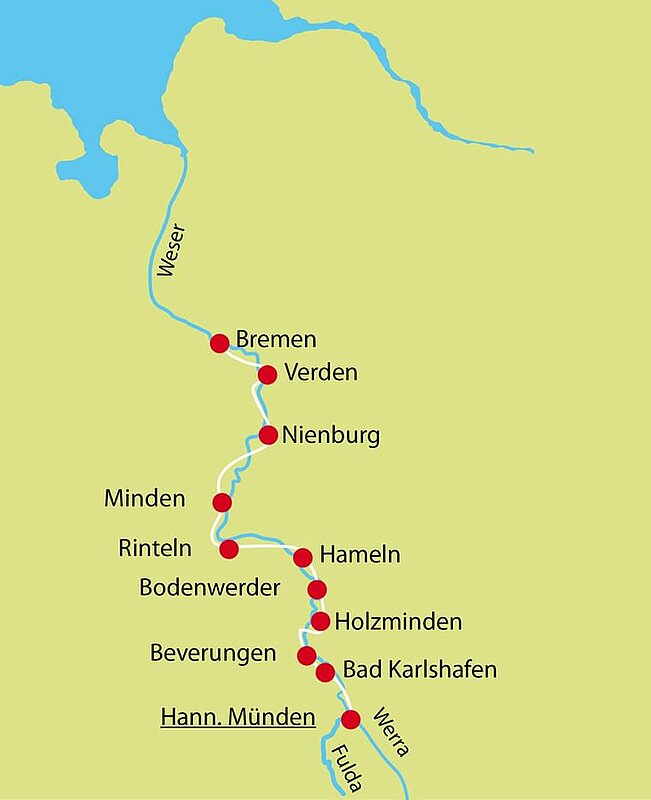 Von hier folgen Sie – meistens auf dem Weserradweg – den Windungen des Flusses durch das Weserbergland, das mit zahlreichen Waldgebieten und kleinen schmucken Orten so manchen Schatz bereithält. Auf Ihrem Radurlaub an Weser und Nebenflüssen wie der Aller treffen Sie auf mittelalterliche Fachwerkstädtchen wie Höxter, Rinteln oder Hameln. Sie begegnen in Bodenwerder dem Lügenbaron Münchhausen und die Rattenfängerstadt Hameln verzaubert Sie am Weserradweg mit einer herrlichen Altstadt. Nienburg besticht auf diesem Radurlaub ebenfalls durch seine Altstadt, Verden mit seinem Dom und die Stadt Bremen mit dem Bremer Rathaus (UNESCO Weltkulturerbe), Roland, Bremer Stadtmusikanten und Schnoorviertel.