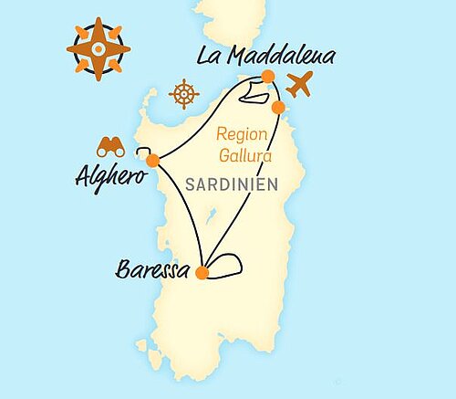 Die Gallura im Nord-Osten gehört mit der Costa-Smeralda zu den schönsten Regionen der Insel. An der Küste genießen Sie weiße Sandstrände mit glasklarem Wasser. Im Landesinneren begegnen Ihnen die typische Korkeichen-Vegetationen und vom Wind geformte Granitfelsen. Auf den beiden kleinen Inseln La…