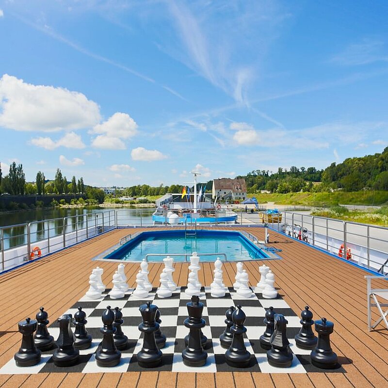 Sonstige Hinweise Bedenken Sie bitte, dass Ihr Flussschiff einerseits Ihr „Urlaubshotel“, andererseits aber auch Arbeitsgerät ist, das sich mit Motorenkraft fortbewegt und ständig, auch nachts (z.T. mit Schleusen- und Brückendurchfahrten) bedient werden muss. Besonders geräuschempfindlichen Gästen empfehlen wir, Ohrstöpsel mitzubringen. Bei Schleusendurchfahrten muss immer mit Störungen gerechnet werden. Bitte beachten Sie: bei Niedrigwasser muss ggf. der Pool geleert werden, um den Tiefgang des Schiffes zu verringern und steht dann nicht zur Verfügung.