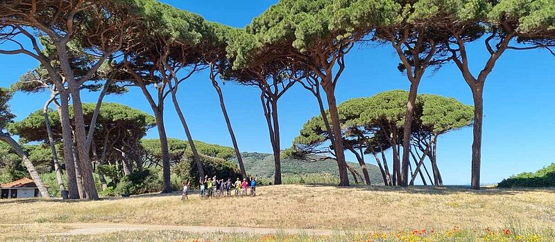 Die maritimen Trails sind das besondere an San Vincenzo und diese gehen wir heute an. Wir fahren in Richtung Süden, parallel zum Sandstrand im Pinienwald. Vorbei an Villen auf Hügeln am Meer, mal etwas zerklüfteter am felsigeren Strand hier bis zum Golfo di Baratti. Hier stehen die Schirmpinien, die in vielen Toskana Bildkalendern abgebildet sind. Die ersten 20 Kilometer dieser Tour werden deshalb mit diversen Fotostops versehen sein. Nach Populonia müssen wir noch etwas hochstrampeln, hier machen wir eine Cappu Pause. Danach wird es ruppiger, wenn wir auf dem Karrenweg und den Trails von Populonia flowige Single Trails mit Meerblicken aus der Höhe kombinieren. Die Tourenlänge können wir nach Lust und Laune bestimmen, die lange Variante ist schon eine gute Herausforderung. Selbst, wenn wir abkürzen fahren wir wieder runter zum Golfo die Baratti auf Uli's aktuellem absoluten Lieblingstrail....lasst Euch überraschen :-). Am Golfo hat es ein sehr empfehlenswertes Restaurant, hier sollten wir unbedingt noch die vorzügliche Pasta genießen, samt einem Gläschen Vermentino. Dieser Blick aufs Meer in Kombination mit diesem Essen und Wein ist einmalig!. Zurück nach San Vincenzo fahren wir auf einer vereinfachten Variante.