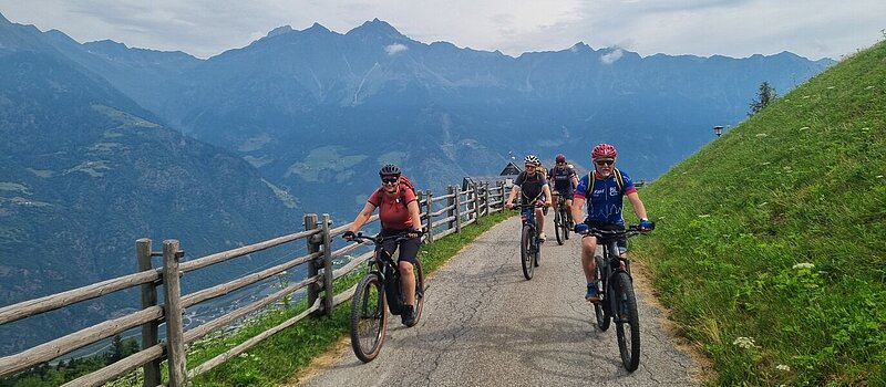Unsere heutige Radtour führt uns ins Passeiertal. Wir folgen der Passer flußaufwärts und genießen die Fahrt durch das idyllische Tal. In Saltaus nehmen wir die Hirzerbahn, die uns bequem bis zur Mittelstation bringt. Von dort radeln wir hinauf zur Hirzer Hütte, wo sich ein beeindruckender Blick über die umliegende Bergwelt eröffnet. Anschließend geht es auf einem traumhaften Panoramaweg wieder bergab in Richtung Dorf Tirol. Unterwegs laden zahlreiche Almen zur Einkehr ein – ideal für eine genussvolle Mittagsrast mit regionalen Spezialitäten. Frisch gestärkt führt uns die Route über Schenna zurück nach Meran, wo wir die Tour ausklingen lassen. Eine abwechslungsreiche Strecke, die Naturerlebnis, Genuss und herrliche Aussichten perfekt miteinander verbindet.