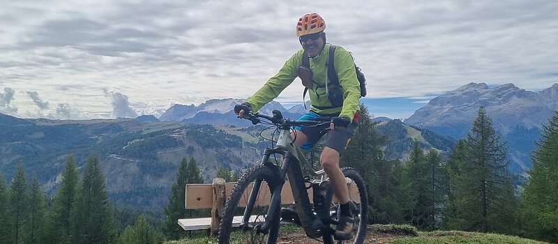 Mit dem Shuttle erreichen wir den Parkplatz Zumis bei den Rodenecker Almen. Über das weite Almplateau rollen wir entspannt dahin, bis uns am Ende ein epischer Singletrail erwartet – einer unserer absoluten Panorama-Lieblinge. Während der Abfahrt öffnet sich ein atemberaubender Blick auf die Dolomiten: von der Fanesgruppe über den Heiligkreuzkofel bis zur Sella und den Geisler Spitzen. Dann geht es bergab – überwiegend auf flowigen Trails der Kategorien S0 und S1, mit kurzen S2-Passagen für Abwechslung, und auf Forstwegen in Richtung Wellschellen. Ein letzter kurzer Anstieg über Asphalt führt uns schließlich hinauf nach St. Vigil, wo die Etappe ausklingt.