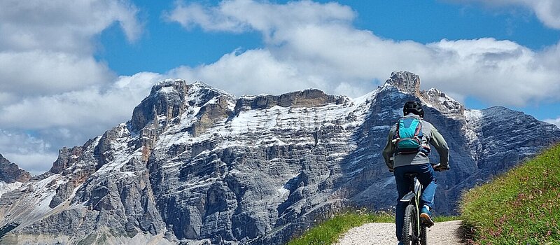 Highlights für alle Sinne: Kletterer lieben die Anstiege zum Valser Jöchl, zur Fanes Alm und hinauf auf die Pralongià. Abfahrer genießen die speedigen Downhills vom Joch und der Kanzel ins Etschtal sowie die Traumtrails auf der Strecke und den legendären Bindelweg. Und fürs Auge warten die großen Hingucker: der wilde Fanes-Nationalpark, die mächtige Marmolada und der farbenprächtige Rosengarten – Dolomiten pur.