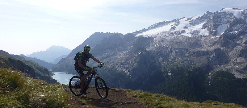 it der ersten Gondel schweben wir hinauf zur Porta Vescovo – die Marmolada scheint zum Greifen nah. Bei trockenen Bedingungen fahren wir den legendären Bindelweg, einen der absoluten Top-Trails der Alpen. Er führt uns mit spektakulären Panoramen bis zum Passo Pordoi, bevor wir über rasante Asphaltkurven fast bis Canazei abtauchen. Von dort folgen wir der Radroute bis Pozza di Fassa und nehmen den Uphill zum Karerpass in Angriff. Zum Abschluss wartet noch ein Highlight: der Tempelweg nach Obereggen. Mit traumhaften Ausblicken auf das Latemar-Massiv bildet er den perfekten Schlusspunkt eines unvergesslichen Tages voller Dolomiten-Panoramen, Trailspaß und alpiner Atmosphäre.