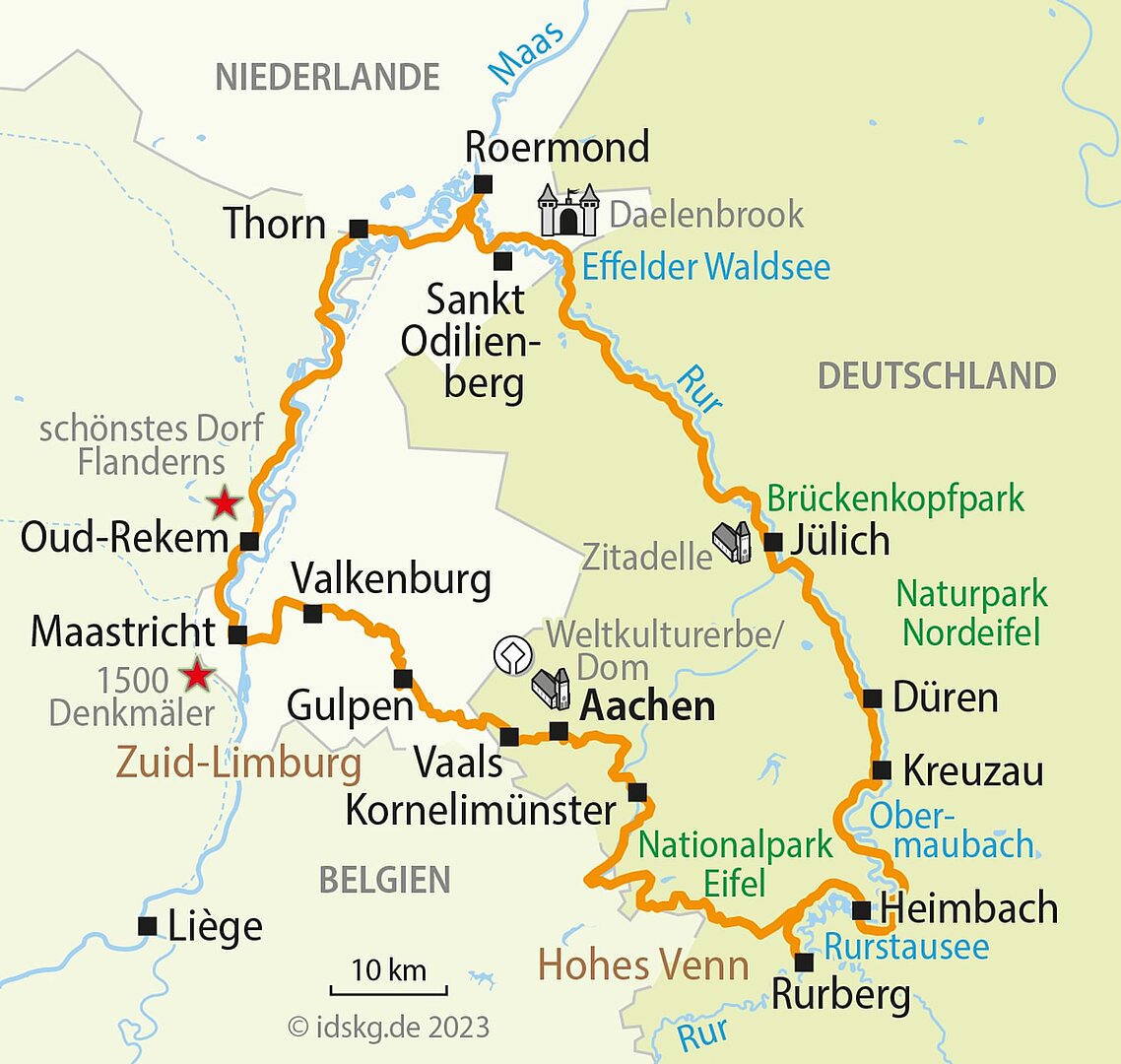 Freuen Sie sich auf diese Rundtour und auf die Domstadt Aachen. Diese Radreise verbindet unterschiedlichste Landschaftserlebnisse in Deutschland, Holland und Belgien auf abwechslungsreichen Radwegen. Die erste Etappe führt ab Aachen auf der bekannten Vennbahntrasse hinauf in die Eifel und weiter zum Rurstausee, dem zweitgrößten Stausee Deutschlands. Anschließend folgen Sie dem Flüsschen Rur, einem Geheimtipp unter Radfreunden, über die historische Festungsstadt Jülich bis in die holländische Grenzstadt Roermond. Hier mündet die Rur in die Maas. Staunen Sie über diesen abwechslungsreichen Flusslauf. Er bietet schönste und bestens ausgebaute Radwege bis in die mittelalterliche Universitätsstadt Maastricht mit ihrer lebendigen Kulturszene. Dabei radeln Sie munter hin und her im holländisch-belgischen Grenzgebiet und können in diesem Freizeiteldorado schmucke Städtchen besuchen wie die weiße Stadt Thorn oder Alt-Rekem, welches 2008 zum „Schönsten Ort Flanderns“ gewählt wurde. Den kulturellen Höhepunkt dieser Radreise bildet die Schlussetappe von Maastricht nach Aachen durch die Provinz Süd-Limburg mit ihren vielen pittoresken Dörfern, Schlössern, Burgen und Kirchen und der faszinierenden unterirdischen Höhlenwelt von Valkenburg.