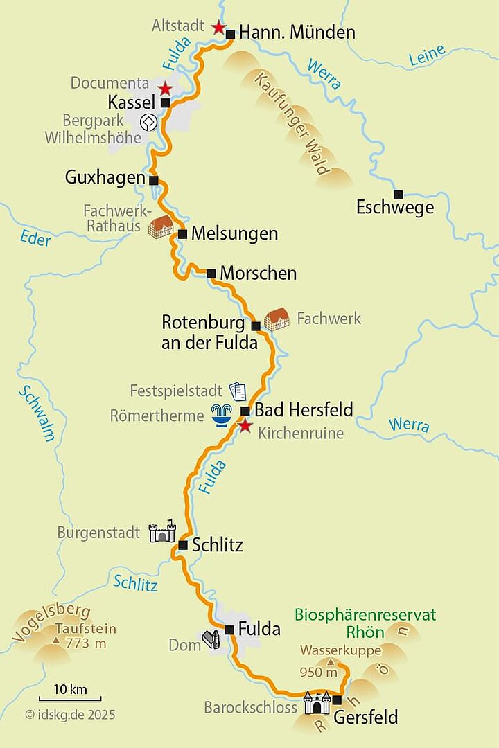 Von der Fuldaquelle nahe der Wasserkuppe (950 m über NN) bis zu Ihrer Mündung in die Weser führt die Radroute durch unterschiedliche Landschaften des nord- und osthessischen Berglandes. Der größte Teil des Fulda-Radwegs verfügt über asphaltierte Radwege und Wirtschaftswege, teilweise geht es auch über verkehrsarme Landstraßen. Selten folgen Sie Schotterwegen.