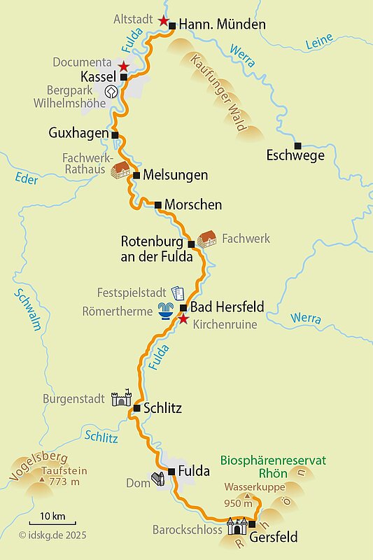 Entdecken Sie diese, vielen Radfreunden noch unbekannte, idyllische Fluss-Radwanderroute. Starten Sie in der wildromantischen Rhön auf 950 m Höhe an der Wasserkuppe und folgen Sie dem gut beschilderten Fulda-Radweg hinab ins Tal. Durch Wiesen und Felder, teilweise direkt am idyllischen Flusslauf entlang rollen Sie durch bildschöne Fachwerkstädtchen und den waldreichen Vogelsberg. Richtig gemütlich sausen Sie auf dem asphaltierten Radweg durch das Flusstal. Schön, dass Sie durch die insgesamt sehr flache Wegeführung ausgiebig Zeit haben, die vielfältigen Sehenswürdigkeiten der Region kennenzulernen! Begeistern wird Sie das Schloss Fasanerie hinter Eichenzell, das Barockviertel von Fulda mit Dom, die Festspielstadt Bad Hersfeld, Kassel mit den vielen Documenta Kunstwerken sowie als Höhepunkt Hann.Münden, eine Fachwerkstadt von europäischem Rang. Hier am Zusammenfluss von Fulda und Werra endet Ihre Radreise oder Sie verlängern Ihren Radurlaub entlang der schönen Weser.