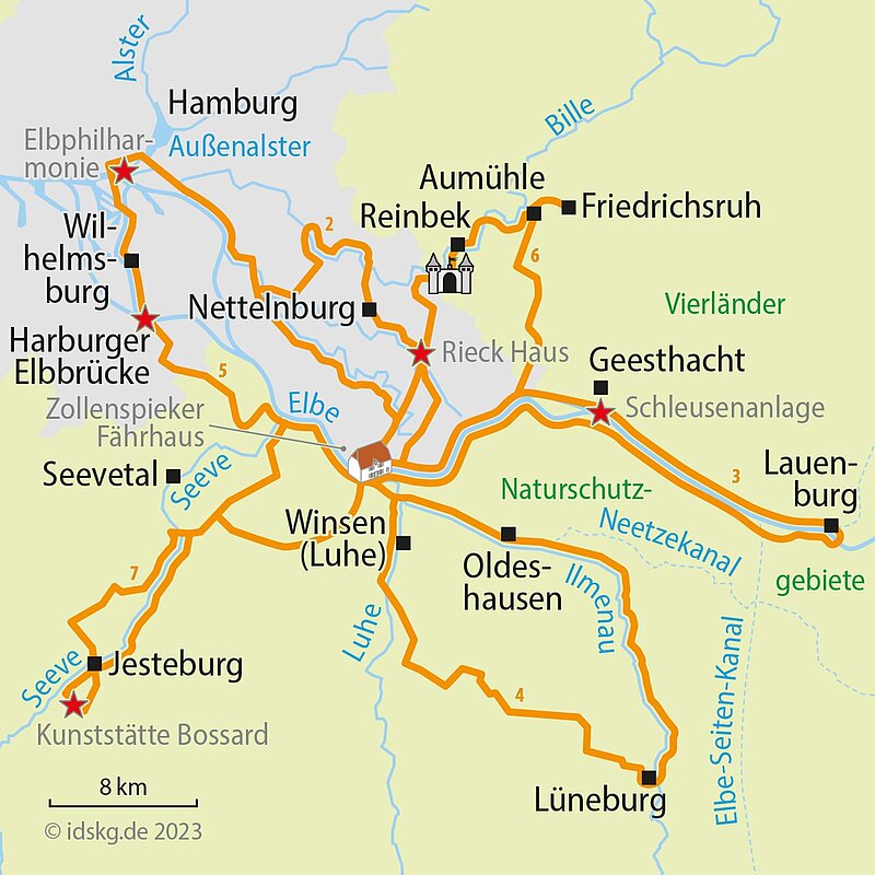 Auch welche Etappe Sie an welchem Tag radeln, bleibt Ihnen frei überlassen. Sie radeln dabei meist auf flachen asphaltierten Wegen, nur kurze Steigungen und einzelne Waldwegpassagen müssen bewältigt werden. In Hamburg und in den Städten lässt sich größerer Straßenverkehr nicht immer vermeiden, doch sind Sie dort meist auf Radwegen unterwegs.