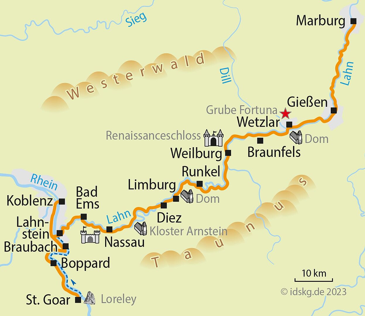 Der Lahn-Radweg gilt als Geheimtipp unter den Radfreunden! Sie werden begeistert sein vom stillen Traum der Natur mit malerischen Fachwerkorten und weiten Naturschutzgebieten. Bummeln Sie durch die engen Gassen der historischen Universitätsstadt Marburg mit der berühmten Elisabethkirche. Besuchen Sie auf Ihrer Radreise die Goethestadt Wetzlar mit dem Lottehaus und das stillgelegte Eisenerzbergwerk Grube Fortuna. Entdecken Sie die Residenzstadt Weilburg mit der sehenswerten Schlossanlage und die komplett unter Denkmalschutz stehende Altstadt von Limburg mit dem weltberühmten Dom. Machen Sie eine Pause am Kloster Arnstein und im historischen Wirtshaus an der Lahn bevor Sie Bad Ems erreichen, eines der schönsten und traditionsreichsten Heilbäder Deutschlands. Krönen Sie Ihre Radtour mit einem Fahrradausflug bis zur Loreley und genießen Sie die Schiffsrückfahrt von St. Goar bis zum Deutschen Eck in Koblenz. Die schönsten Übernachtungsorte im Lahntal sowie die ausgewogene Streckenführung bieten allen Radfreunden ausreichend Zeit, die vielen Sehenswürdigkeiten zu genießen.