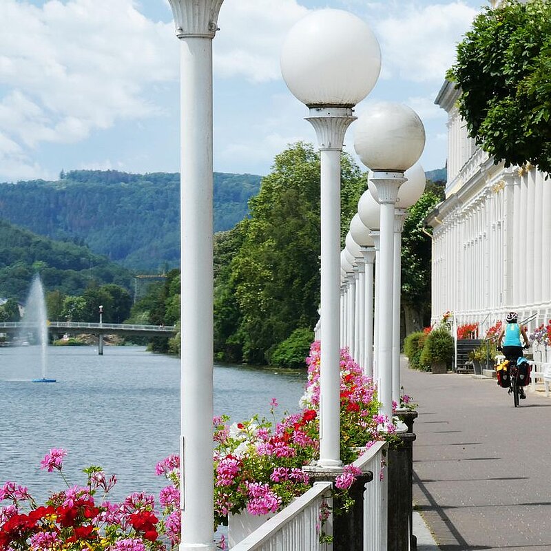 Genießen Sie heute einen landschaftlichen Höhepunkt: Abseits jeglichen Verkehrs rollen Sie über den Lahn-Radweg durch eine unberührte Tallandschaft von Diez bis Balduinstein. Einen Anstieg hält dieser Tag bereit. Erholen Sie sich danach bei einer Rast am Kloster Arnstein oder an der Burg Nassau ehe Sie Bad Ems erreichen. Erholen Sie sich danach bei einer Rast am Kloster Arnstein oder an der Burg Nassau ehe Sie in Bad Ems einradeln. Sie werden begeistert sein, denn Ihr erster Blick gilt gleich dem architektonischen Schmuckstück von Bad Ems: in einer langen Reihe präsentiert sich das Kurhaus, das Kurcafe, der Marmorsaal, das Kurtheater und das Casino. Diese "Schokoladenseite" zur Lahn findet eine würdige und schöne Fortsetzung in den Gartenanlagen des Kurparks. Genießen Sie Ihren Aufenthalt und lassen Sie die Seele baumeln. Ganz zentral wohnen Sie im Häckers Grand Hotel & Spa Resort.