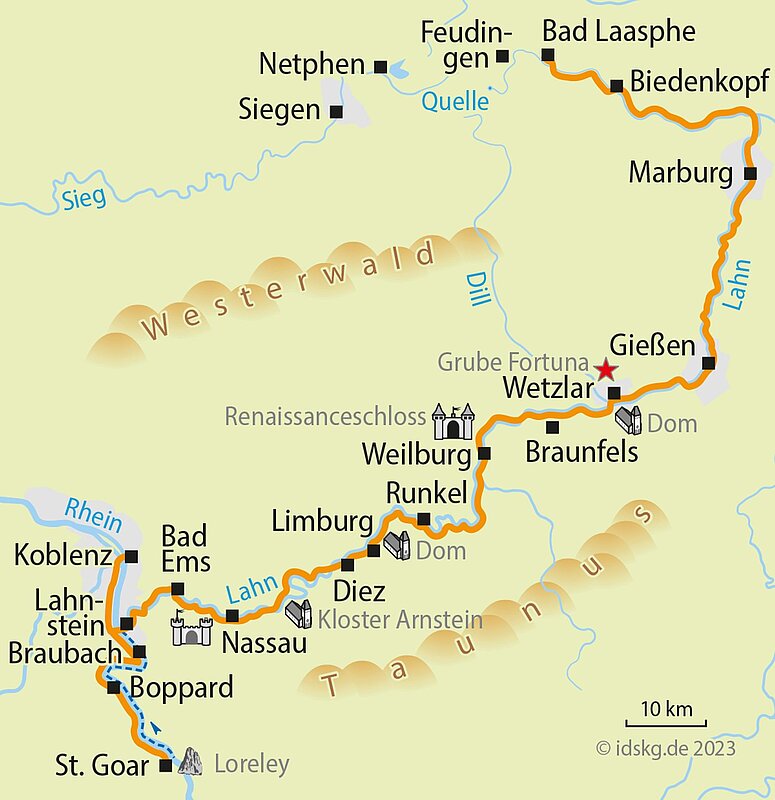 Nutzen Sie den Anreisetag schon für einen Ausflug zur Lahnquelle und bummeln Sie tags darauf in Marburg durch die engen Gassen der historischen Universitätsstadt mit der berühmten Elisabethkirche. Besuchen Sie auf Ihrer Reise die Goethestadt Wetzlar mit dem Lottehaus und das stillgelegte Eisenerzbergwerk Grube Fortuna. Entdecken Sie die Residenzstadt Weilburg mit der sehenswerten Schlossanlage und die komplett unter Denkmalschutz stehende Altstadt von Limburg mit dem weltberühmten Dom. Machen Sie eine Pause am Kloster Arnstein bevor Sie Bad Ems erreichen, eines der schönsten und traditionsreichsten Heilbäder Deutschlands. Krönen Sie Ihre Radreise mit einem Fahrradausflug bis zur Loreley und genießen Sie die Schiffsrückfahrt von St. Goar bis nach Koblenz. Die schönsten Übernachtungsorte im Lahntal sowie die ausgewogene Streckenführung bieten allen Radfreunden ausreichend Zeit, die vielen Sehenswürdigkeiten zu genießen.