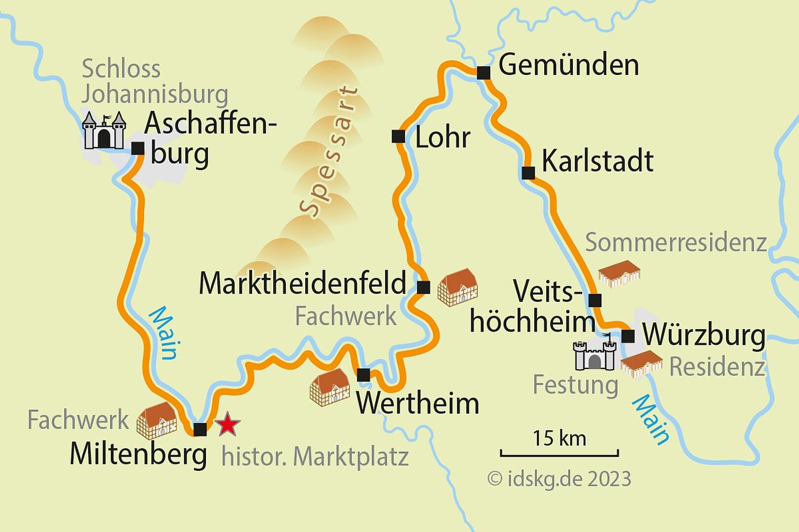 Ganz nah rücken die bewaldeten Hügel aneinander, durch die sich der Main hindurchschlängelt. Vorbei an dem Städtchen Rothenfels, dessen Burg das enge Tal bewacht, radeln Sie bis Marktheidenfeld und Wertheim. Lassen Sie sich hier verzaubern von den anmutigen Fachwerkhäuschen der verwinkelten Altstadt.