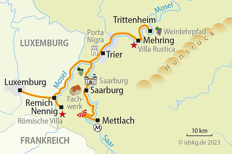 wunderschönen Mosaikfußboden. 1852 stieß ein Bauer beim Ausheben einer Rübengrube auf Mosaiksteinchen, die sich als Teile eines repräsentativen römischen Mosaikfußbodens entpuppten. Der Boden lag wohl in der großen Empfangshalle einer prachtvollen Villa urbana, die sich ein reicher römischer Gutsherr hier im lieblichen Moseltal an der Römerstraße Metz - Trier hat bauen lassen. Sie übertraf in Größe und Ausstattung alle römischen Paläste, die man im Moselraum bislang aufgefunden hat. Sie haben also heute die Qual der Wahl. Entweder Sie besichtigen die Römische Villa und radeln anschließend 42 km gemütlich auf dem Mosel Radweg zurück nach Trier oder Sie radeln morgens direkt von Trier moselaufwärts bis Nennig und setzen dort die Tour fort mit einem Radausflug nach Luxemburg Stadt (+ ca. 32 km). Diese Radetappe empfehlen wir sportlichen Fahrern. Am Abend setzten Sie sich dann gemütlich in Luxemburg in die Bahn und sausen zurück nach Trier (Dauer 50 Minuten).