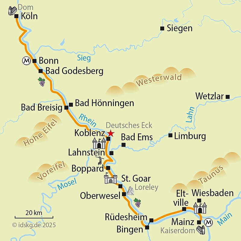 Bei diesem 7-tägigen Radurlaub erleben Sie den Rhein-Radweg richtig intensiv, denn nicht umsonst ist diese Tour von Mainz bis Köln der Klassiker unter all unseren Rheinreisen. Sie starten in Mainz, wo der Rhein die letzte Brücke bis Koblenz hinter sich lässt. Freuen Sie sich auf den sonnenverwöhnten Rheingau mit seinen herrlichen Weinbergen und köstlichen Weinen und auf einen abendlichen Bummel durch die weltberühmte Drosselgasse in Rüdesheim. Zwischen Hunsrück und Taunus bahnt sich der Rhein seinen Weg. Dicht an seiner Seite radeln Sie durch das enge sagenumwobene Rheintal vorbei an Drachenfelsen und Loreley. Herrliche Orte wie Boppard, Städte wie Koblenz mit kurfürstlicher Residenz, Bad Godesberg und Bonn liegen auf Ihrem Weg bis in die pulsierende Domstadt Köln. Unterwegs locken Schlösser, Burgen und Klöster; Museen, Cafes und Restaurants sowie eine abwechslungsreiche Flusslandschaft mit täglich neuen Erlebnissen. Also ein echter Klassiker, der keine Wünsche offen lässt!