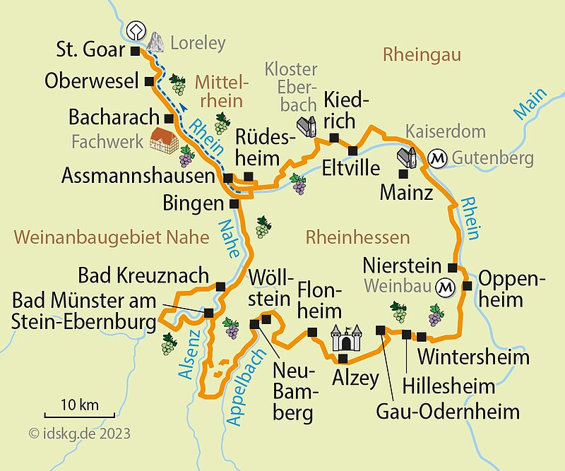 Bei dieser insgesamt hügeligen Tour radeln Sie einerseits auf dem Rhein-Radweg und dem Nahe-Radweg, ansonsten oft inmitten der Weinberge teils auf separaten Radwegen, teils auch auf den typischen kleinen Asphaltsträßchen und Wirtschaftswegen, die nur für die Winzerfahrzeuge (und Radfahrende) freigegeben sind. In den Weinbergen sind zwei kurze holprige Schiebestrecken ebenso dabei wie einzelne nicht asphaltierte Passagen. Es ist also nicht immer der Komfort eines flachen, asphaltierten Radwegs gegeben, dafür sind Sie dann aber auch wirklich inmitten der Reben unterwegs, meist gepaart mit schönen Ausblicken!