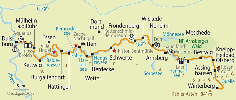 Einer der abwechslungsreichsten und vielseitigsten Flüsse Deutschlands lädt mit seinen Uferwegen ein zur Entdeckung einer ganzen Region. Kein anderer Fluss verbindet Kultur und Natur auf so engem Raum. Auf den 230 Kilometern von der Quelle bei Winterberg bis zur Mündung in den Rhein bei Duisburg verbindet die Ruhr die ursprüngliche Landschaft des Sauerlandes mit der aufregenden und erlebnisreichen Metropole Ruhr. Im Sauerland geht es meist bergab durch die Weite der Berge und Wälder, ehe im Ruhrgebiet das Tal umrahmt wird von Industriedenkmälern, Burgen und Fachwerkorten. Hier wird der Fluss gleich mehrfach zu großen Seen aufgestaut, die als attraktive Freizeit- und Erholungsreviere dienen und von schönen Radwegen gesäumt sind.
