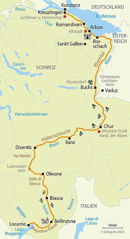 Radeln Sie vom Bodensee zum Lago Maggiore durch die Schweiz auf dieser mittelschweren 8-tägigen Radreise über ca. 329 km. Die Route führt am Bodenseeufer entlang über Rorschach und das Rheintal nach Chur, der ältesten Stadt nördlich der Alpen. Weiter geht es durch die wilde Rheinschlucht und über den anspruchsvollen Lukmanierpass ins Tessin. Vorbei an der Festung Bellinzona mit ihren drei Burgen erreichen Sie Locarno am Lago Maggiore. Übernachtung in Mittelklassehotels mit Frühstück und Gepäcktransport inklusive.
