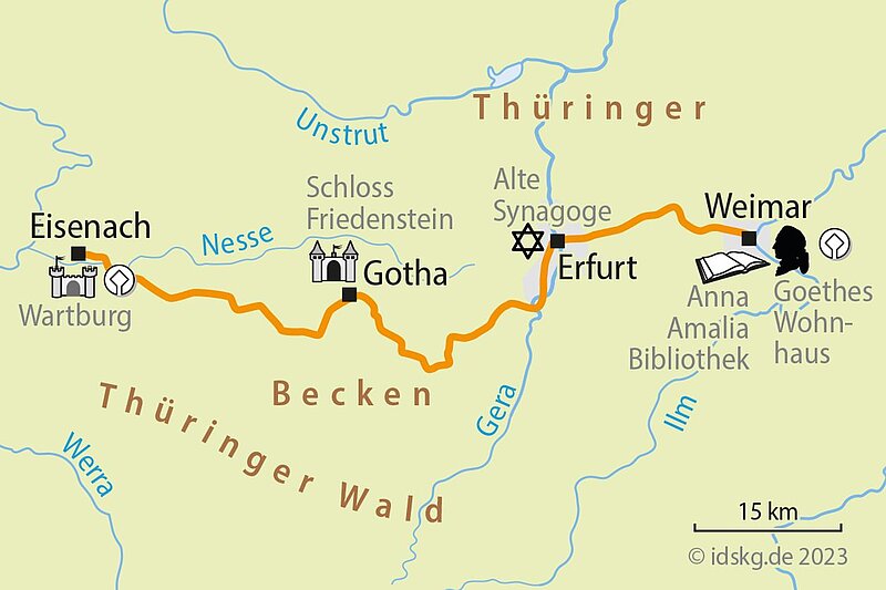Der Radfernweg „Thüringer Städtekette“ verbindet auf diesem Teilabschnitt vier der schönsten Thüringer Städte. Die Route führt von der Wartburgstadt Eisenach über die Residenzstadt Gotha zunächst bis in die Domstadt Erfurt. Weiter geht es dann in die Klassikerstadt Weimar zu Schiller und zum idyllisch im Park gelegenen Goethe Gartenhaus. Auf dieser Reise wird Kultur großgeschrieben. Bei täglichem Radetappen mit 25 bis 41 km bieten die Nachmittage noch viel Zeit für all die Sehenswürdigkeiten und Highlights - Entspannt viel erleben.