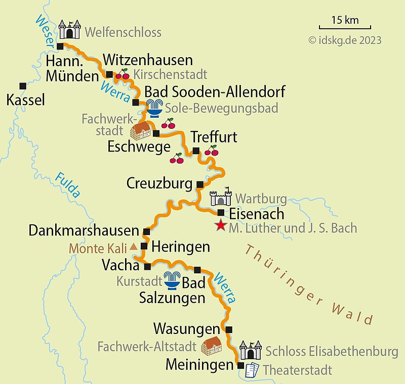 Von den Höhen des Rennsteigs windet sich die Werra, malerisch eingezwängt zwischen Rhön und Thüringer Wald. Auf dem Weg zur Drei-Flüsse-Stadt Hann. Münden, wo sie sich mit der Fulda zur Weser vereinigt, durchquert sie pittoreske Fachwerkorte, Kurorte, Residenz- und berühmte Kulturstädte. Genießen Sie ab Meiningen knapp 250 km gut ausgebauten Radweg mit nur wenigen Steigungen und einheitlicher, hervorragender Beschilderung.