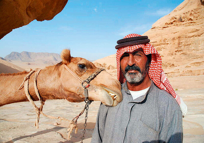 Auf den Spuren nabatäischer Karawanen erforschen wir das weitläufige, von Sandsteinschluchten und unberührten Dünen durchzogene Wadi Rum. Wir fahren auch abseits der großen Straßen direkt auf festem Wüstensand – ein echtes Highlight! Die traumhafte Wüstenlandschaft wird uns bestimmt genauso faszinieren wie einst Lawrence von Arabien. (F, M, A)