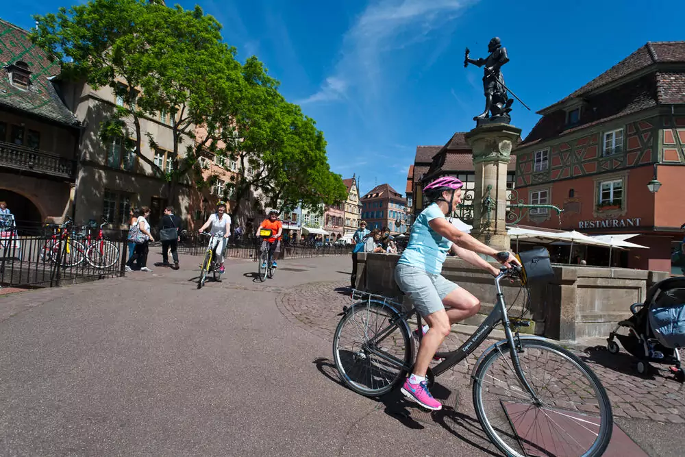 Morgens fahren wir zunächst nach Sélestat. Weiter geht es durch kleine Rieddörfer und ab Marckolsheim entlang des Rhein-Rhône-Kanals. Unser Tagesziel ist die bedeutende Kunststadt Colmar. In der Altstadt wirst du das Gefühl haben, Teil einer lebensgroßen Postkarte zu sein. Die buntbemalten Fachwerkhäuser, viele Blumen und traditionelle Gasthäuser vermitteln das klassische Bild des Elsass.