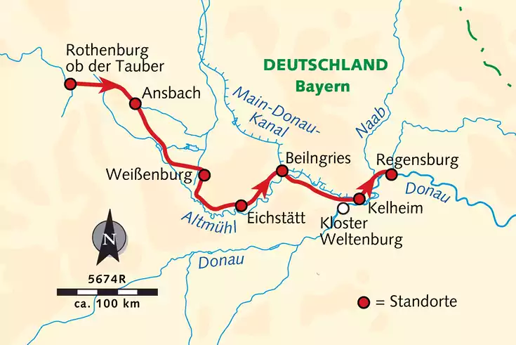 Wir radeln auf befestigten Wald-, Feld- und Radwegen sowie kleinen, verkehrsarmen Nebenstraßen. Die Strecke verläuft meist eben am Ufer der Altmühl entlang. Ab Kelheim folgen wir dem Donau-Radweg in einem breiten Tal bis Regensburg.