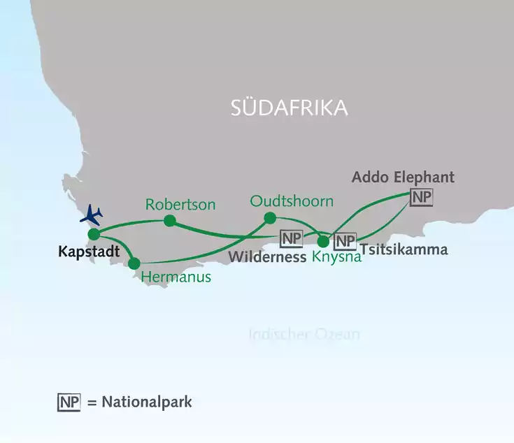 Bei unserer Ankunft in Kapstadt begrüßt uns unsere Reiseleitung mit einem fröhlichen „Goeie dag!“. Mit dem Kleinbus gelangen wir in das pulsierende Zentrum Kapstadts und erkunden eine der schönsten Städte der Welt mit dem Bus und zu Fuß. Je nach Ankunftszeit und Wetterlage können wir mit der Seilbahn auf den Tafelberg fahren (fakultativ), um den grandiosen Ausblick zu genießen. Am nächsten Morgen fahren wir entlang der Halbinsel bis zum berühmten Kap der Guten Hoffnung, dem südwestlichsten Punkt Südafrikas. Es geht weiter zum Cape Point. Zurück in Kapstadt, steht uns der Nachmittag zur freien Verfügung. 2 Hotelübernachtungen. 70 km und 180 km. (1 x A, 2 x F)