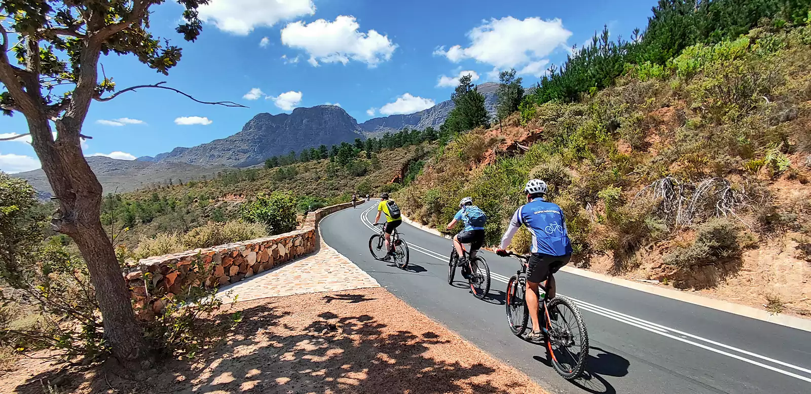 Fahrt per Bus nach Wellington. Von dort fahren wir auf unseren E-Bikes den Bainskloof-Pass hinauf, welcher als einer der bezauberndsten Pässe des Landes gilt. Der Anstieg über die Passstraße wird uns durch malerische Landschaften, eindrucksvolle Felsformationen und phänomenale Ausblicke versüßt. Oben angekommen, genießen wir den tollen Ausblick und freuen uns auf die nun folgende lange Abfahrt durch diese traumhafte Kulisse bis zum Calabash Bush Pub. Hier gönnen wir uns eine Pause. Transfer nach Wellington/Robertson, wo wir auf einem schön gelegenen Weingut übernachten. 1 Hotelübernachtung. 200 km. (F, A)