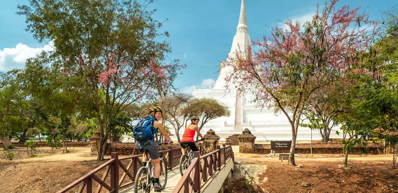 Unsere heutige Radtour führt uns auf Thepho Island durch Reisfelder und am Fluss Chao Phraya entlang. Am Nachmittag bringt uns der Bus zum Tempel Wat Pa Mok aus der Ayutthaya-Zeit mit einer etwa 22,5 m langen, liegenden Buddha-Statue. Weiter geht es in die historische Metropole Ayutthaya, die einst eine der größten und prachtvollsten Städte des Orients war. Sie wurde 1767 völlig zerstört, doch die eindrucksvollen Ruinen zeugen noch immer von einstigem Glanz. Hotelübernachtung in Ayutthaya. (F, A)